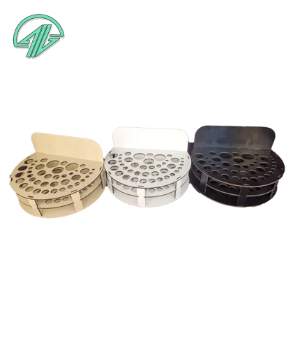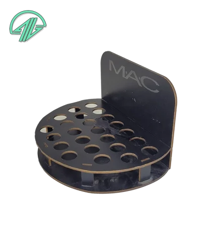استند نیم‌دایره رژ مایع با ظرفیت ۲۴ عدد، طراحی منحنی و حفره‌های دایره‌ای ۲۰ میلی‌متری. ساخته‌شده از MDF سه میل، سبک و مقاوم. در سه رنگ مشکی، سفید و کرم موجود است. مناسب ویترین، سالن زیبایی و میز آرایش. کد محصول: 2206.