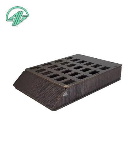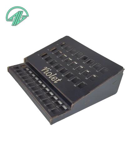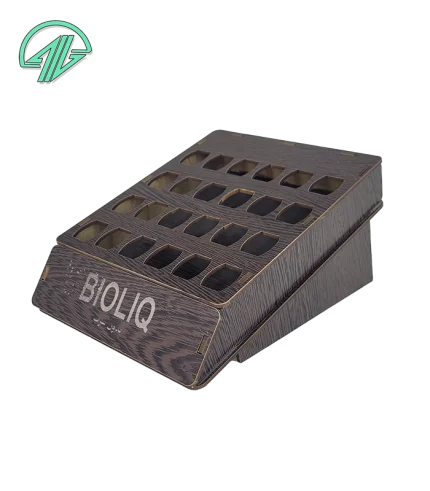استند شیب‌دار رژ مایع ۲۴ عددی با حفره کناره هلالی (۲۲×۱۹ میلی‌متر)، مناسب برای رژهای مایع خاص. طراحی حرفه‌ای شیب‌دار، ساخته‌شده از MDF سه میل در رنگ‌های مشکی، سفید و کرم. ایده‌آل برای فروشگاه‌ها، سالن‌های زیبایی و استفاده خانگی. کد محصول: 2204.