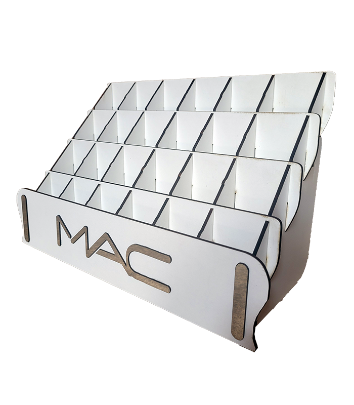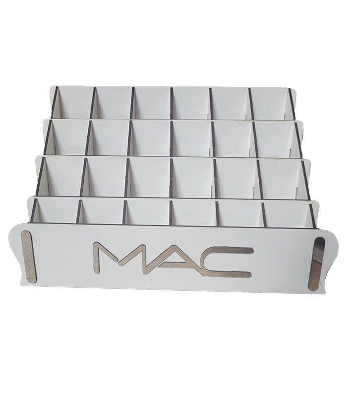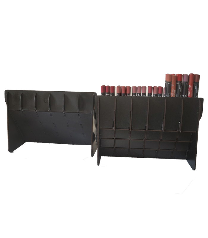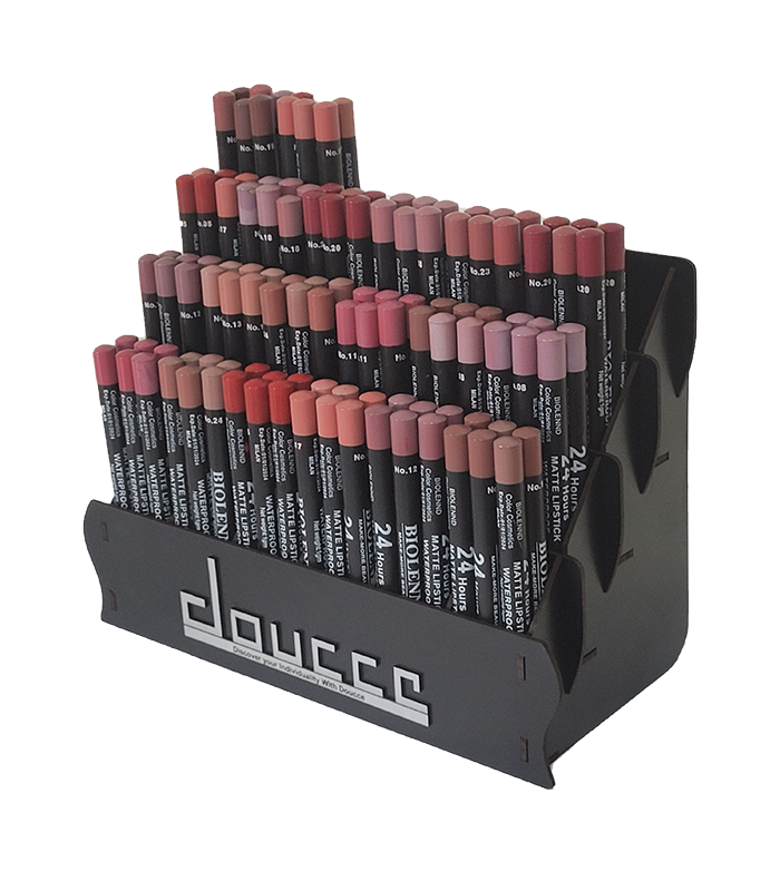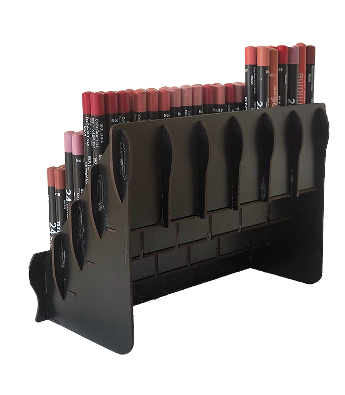 استند خط لب از امدیاف ۳ میلیمتر باکیفیت ساخته شده و در رنگهای محبوب مشکی، سفید و کرم عرضه میشود. طراحی چهار طبقه پلهای آن امکان نمایش ۶ رنگ یا مدل در هر ردیف را فراهم میکند، که برای نمایش ترکیبی رنگی محصولات بسیار مناسب است. همچنین در صورت نیاز به رنگ خاص، امکان سفارش سفارشی نیز وجود دارد.