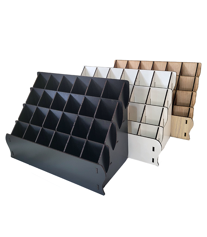 این استند دارای ۲۴ حفره بوده و ظرفیت نگهداری ۲۸۸ عدد مداد خط لب را دارد (هر حفره مناسب برای یک جین ۱۲ عددی). قطر حفرهها دقیقاً متناسب با مدادهای ظریف خط لب (۹ میلیمتر) طراحی شدهاند تا از لق زدن یا افتادن مدادها جلوگیری شود. همین دقت در طراحی، باعث میشود که مدادها به صورت منظم و حرفهای در معرض دید قرار بگیرند.
