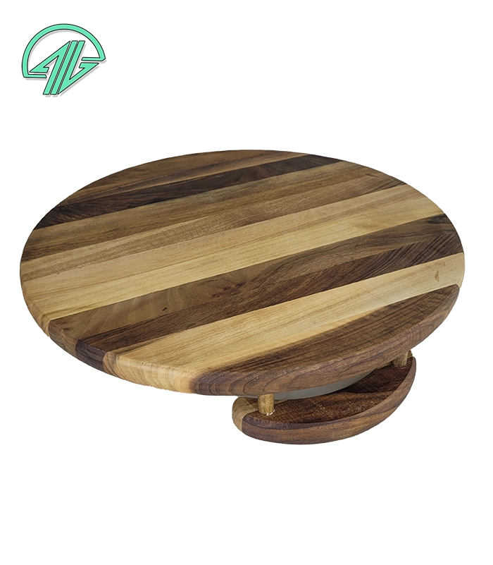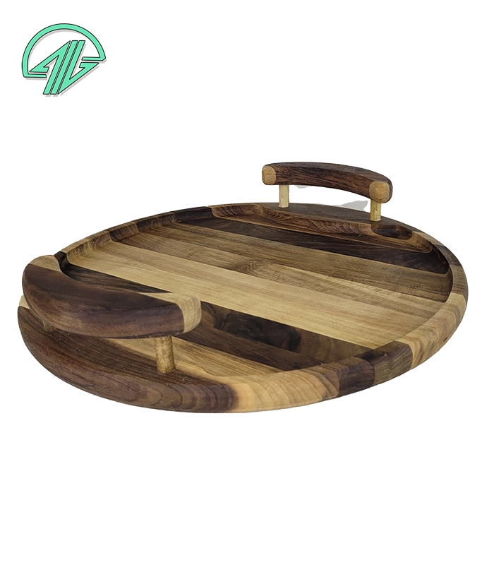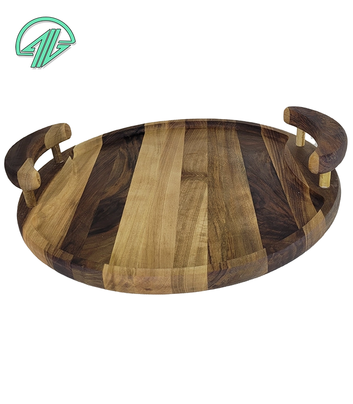 سینی دایره‌ای ساخته‌شده از چوب گردو با دسته‌های چوبی؛ ترکیبی از طراحی سنتی و کاربرد روزمره برای سرو و دکور.