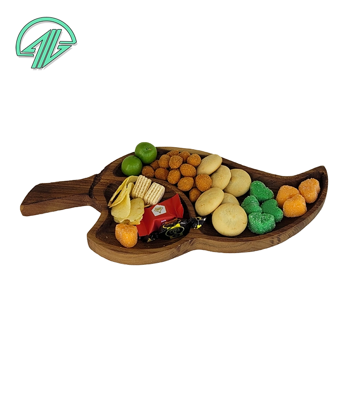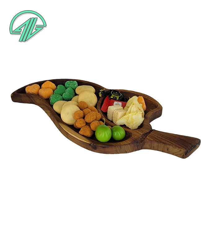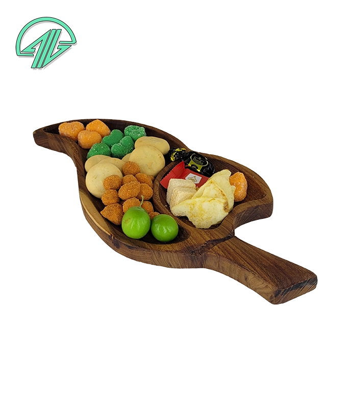 با الهام از زیبایی برگ‌های طبیعی، این ظرف دو خانه چوبی گزینه‌ای ایده‌آل برای سرو شیک و متفاوت در پذیرایی روزمره یا رسمی است 🍃. تقسیم‌بندی دوگانه آن به شما این امکان را می‌دهد که هم‌زمان دو نوع خوراکی را به‌زیبایی در یک ظرف سرو کنید.